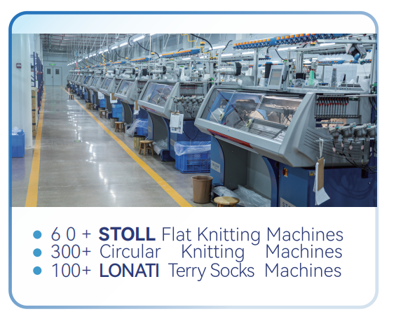 Steriger betreibt eine moderne Produktionsstätte auf über 25.000 Quadratmetern, ausgestattet mit über 60 STOLL-Flachstrickmaschinen, 300 Rundstrickmaschinen und 100 LONATI-Frottiersockenmaschinen. Dieser umfangreiche Aufbau unterstützt eine effiziente Produktion, eine konsistente Qualitätskontrolle und die Fähigkeit, vielfältige Anpassungsanforderungen für globale Kunden zu erfüllen.